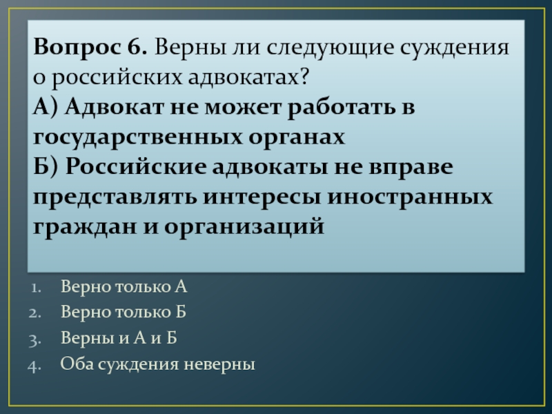 Слайд 28Вопрос 6. Верны ли следующие суждения о российских адвокатах?