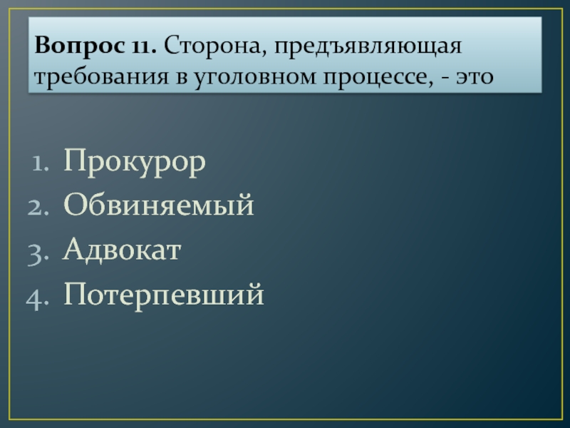 Слайд 33Вопрос 11. Сторона, предъявляющая требования в уголовном процессе, - это