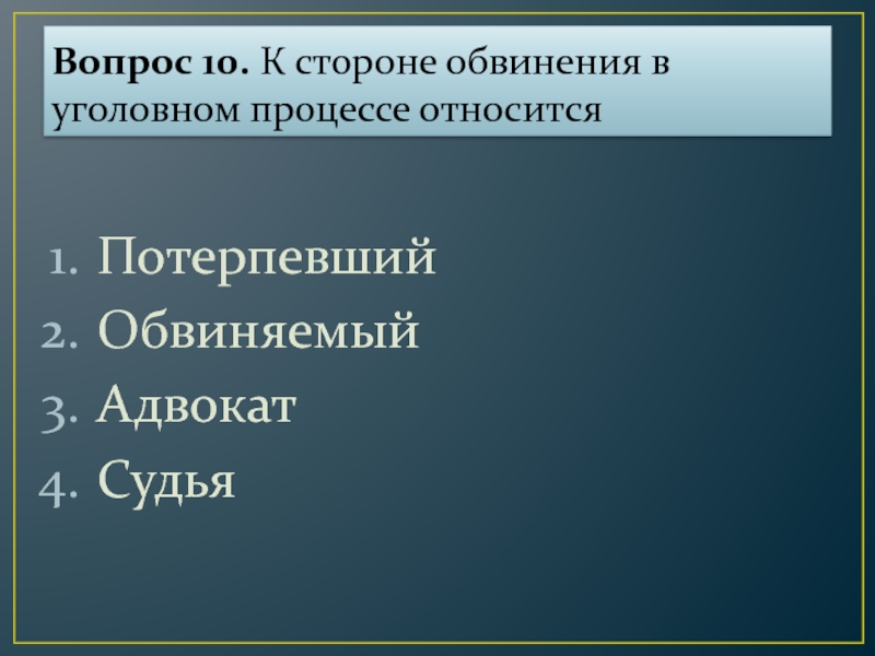 Слайд 32Вопрос 10. К стороне обвинения в уголовном процессе относится