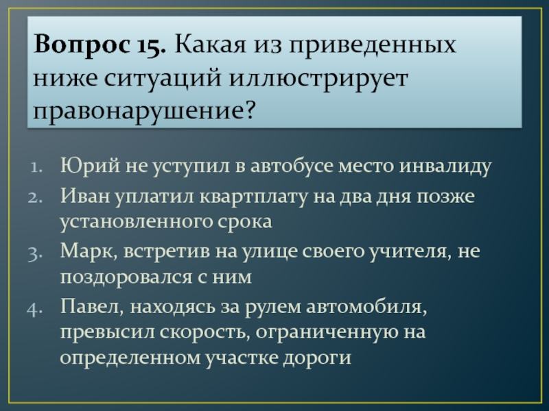 Слайд 37Вопрос 15. Какая из приведенных ниже ситуаций иллюстрирует правонарушение?
