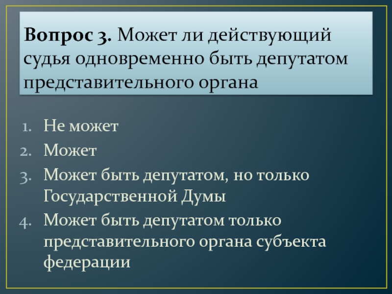 Слайд 25Вопрос 3. Может ли действующий судья одновременно быть депутатом представительного