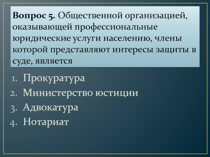 Слайд 27Вопрос 5. Общественной организацией, оказывающей профессиональные юридические услуги населению, члены