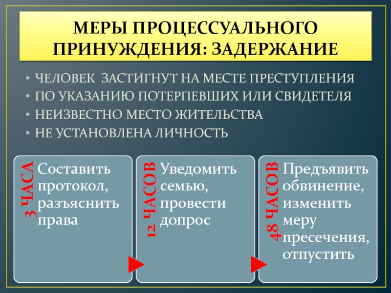 Слайд 11МЕРЫ ПРОЦЕССУАЛЬНОГО ПРИНУЖДЕНИЯ: ЗАДЕРЖАНИЕ