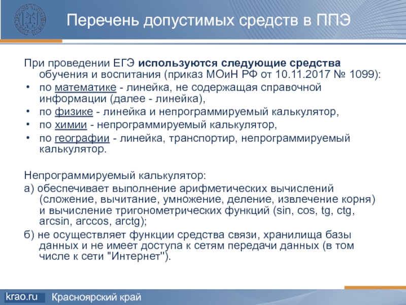 Приказ МОиН РФ от 10.11.2017 № 1099 «Об утверждении единого расписания и продолжительности проведения ЕГЭ по каждому учебному предмету, перечня средств обучения и воспитания, используемых при проведении в 2018 году» (вступает в силу 18.12.2017)