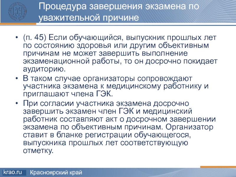 Окончание экзамена (предупреждение организаторов, сдача материалов, п. 81 - в случае нарушения Порядка – подача апелляции, выход из ППЭ)