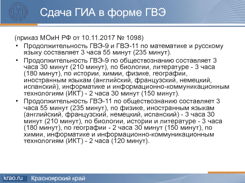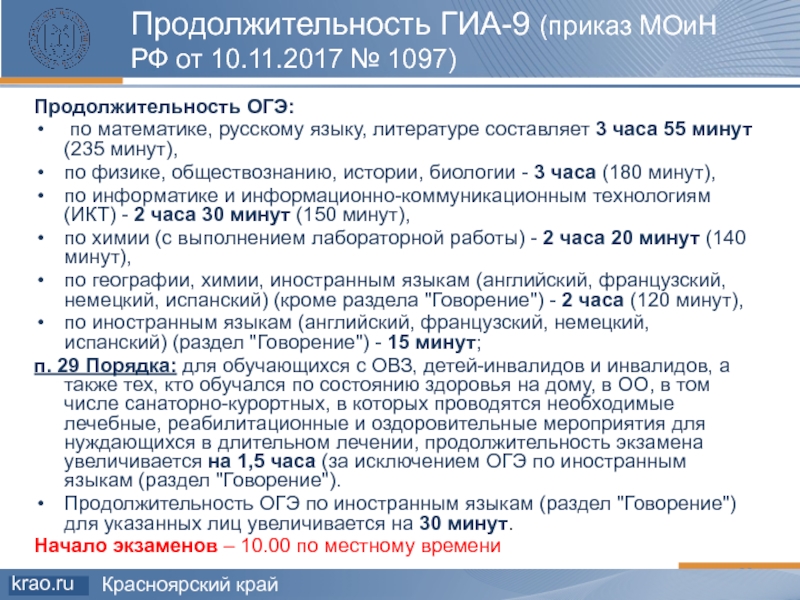 Слайд 30Продолжительность ГИА-9 (приказ МОиН РФ от 10.11.2017 № 1097)