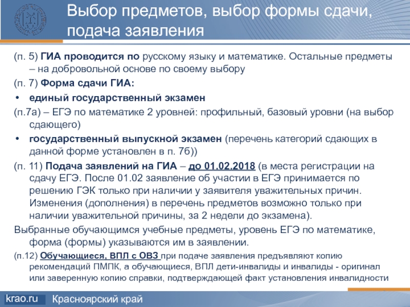 (п. 11) Подача заявлений на ГИА – до 01.02.2018 (в места регистрации на сдачу ЕГЭ. После 01.02 заявление об участии в ЕГЭ принимается по решению ГЭК только при наличии у заявителя уважительных причин. Изменения (дополнения) в перечень предметов возможно только при наличии уважительной причины, за 2 недели до экзамена).