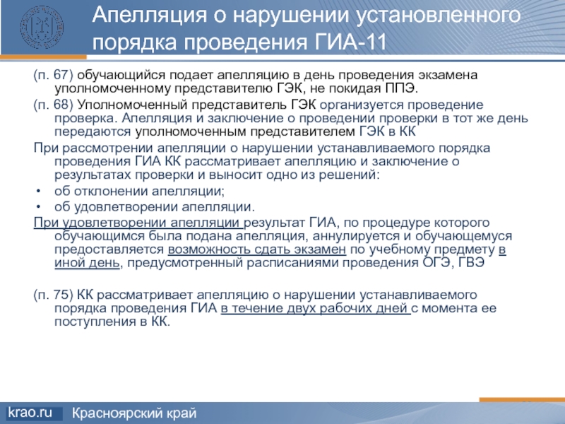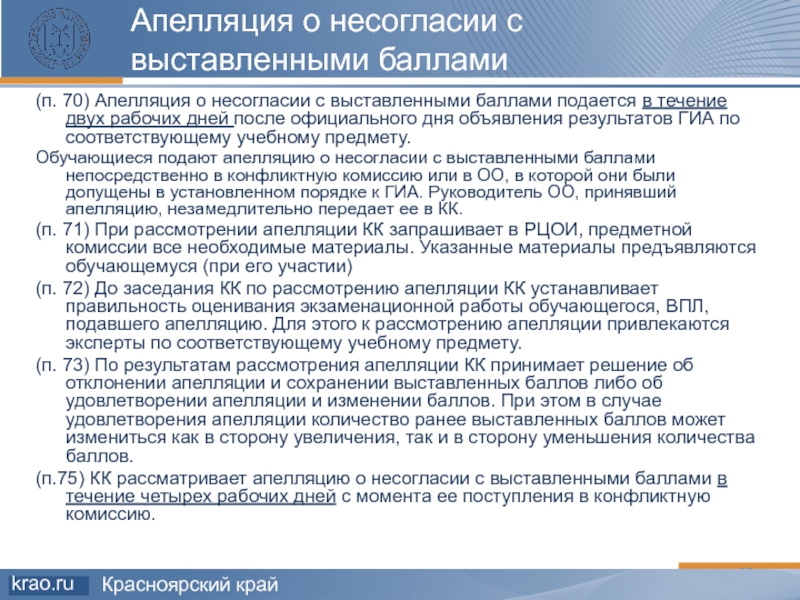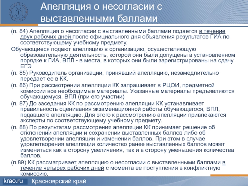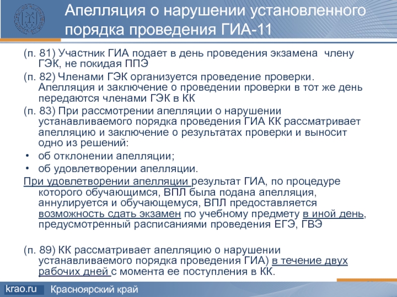 (п. 75) КК рассматривает апелляцию о нарушении устанавливаемого порядка проведения ГИА в течение двух рабочих дней с момента ее поступления в КК.