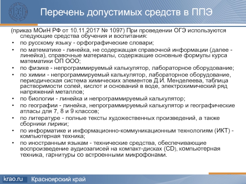 русскому языку - орфографические и толковые словари; по математике - линейка, не содержащая справочной информации (далее - линейка), справочные материалы, содержащие основные формулы курса математики Оп ООО; по физике - непрограммируемый калькулятор; по химии - непрограммируемый калькулятор, периодическая система химических элементов Д.И. Менделеева, таблица растворимости солей, кислот и оснований в воде, электрохимический ряд напряжений металлов; по географии - непрограммируемый калькулятор и географические атласы для 7, 8 и 9 кл.; по литературе - полные тексты художественных произведений, а также сборники лирики; по информатике и ИКТ - компьютерная техника
