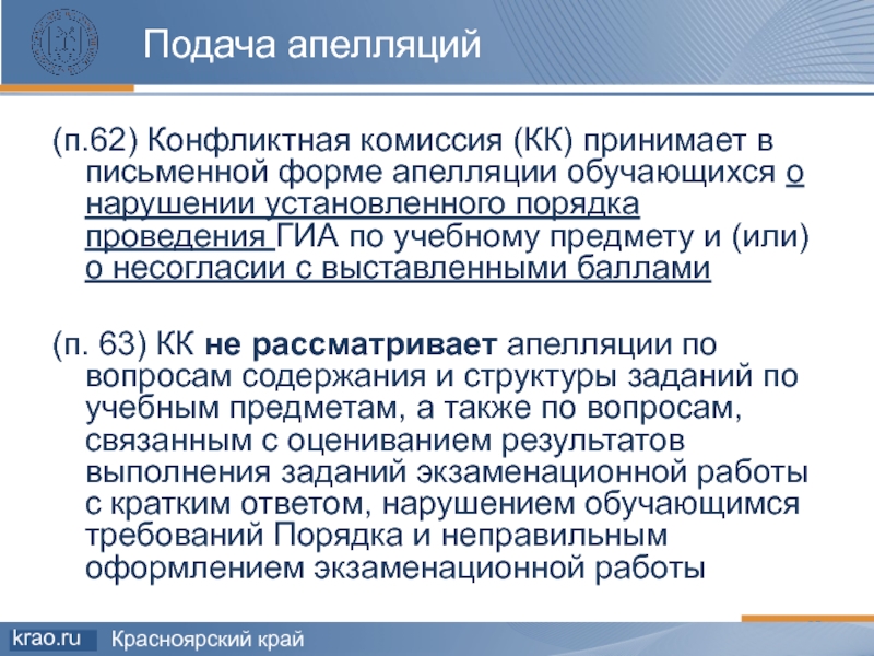 (п. 63) КК не рассматривает апелляции по вопросам содержания и структуры заданий по учебным предметам, а также по вопросам, связанным с оцениванием результатов выполнения заданий экзаменационной работы с кратким ответом, нарушением обучающимся требований Порядка и неправильным оформлением экзаменационной работы