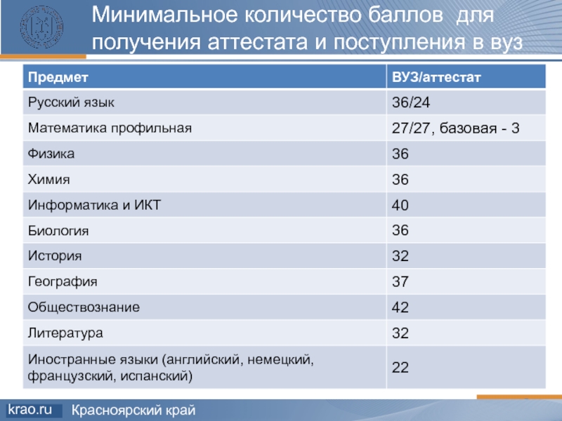Слайд 7Минимальное количество баллов для получения аттестата и поступления в вуз