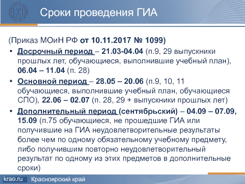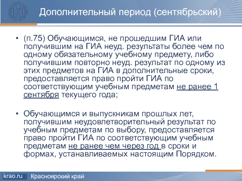 Дополнительный период (сентябрьский) – 04.09 – 07.09, 15.09 (п.75 обучающиеся, не прошедшие ГИА или получившие на ГИА неудовлетворительные результаты более чем по одному обязательному учебному предмету, либо получившим повторно неудовлетворительный результат по одному из этих предметов в дополнительные сроки)