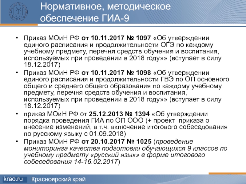 Приказ МОиН РФ от 10.11.2017 № 1098 «Об утверждении единого расписания и продолжительности ГВЭ по ОП основного общего и среднего общего образования по каждому учебному предмету, перечня средств обучения и воспитания, используемых при проведении в 2018 году» (вступает в силу 18.12.2017)