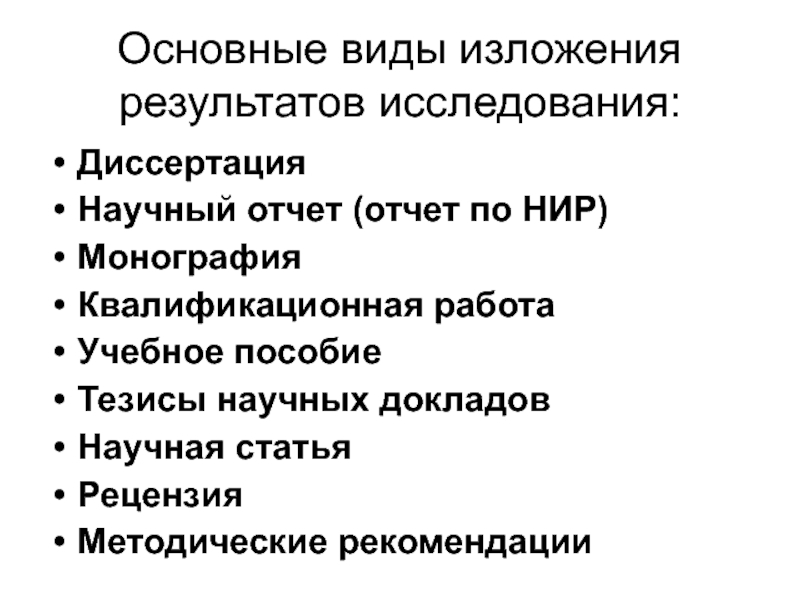 Слайд 19Основные виды изложения результатов исследования: