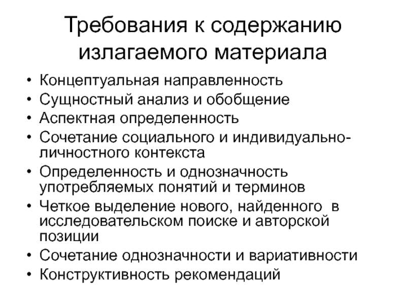 Слайд 20Требования к содержанию излагаемого материала