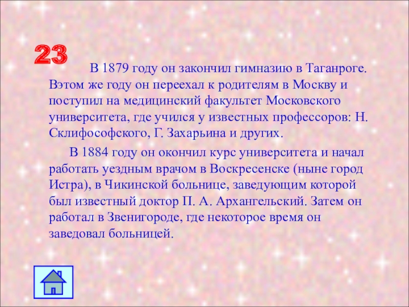 родителям в Москву и поступил на медицинский факультет Московского университета, где учился у известных профессоров: Н. Склифософского, Г. Захарьина и других.