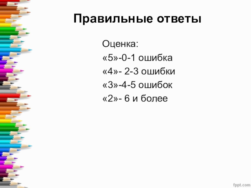Правильные ответыОценка:«5»-0-1 ошибка«4»- 2-3 ошибки«3»-4-5 ошибок«2»- 6 и более