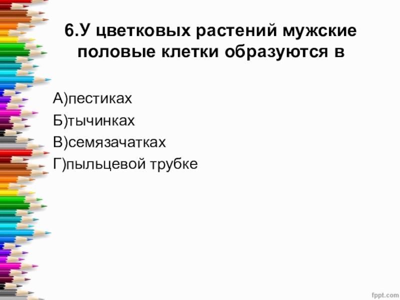 6.У цветковых растений мужские половые клетки образуются вА)пестикахБ)тычинкахВ)семязачаткахГ)пыльцевой трубке