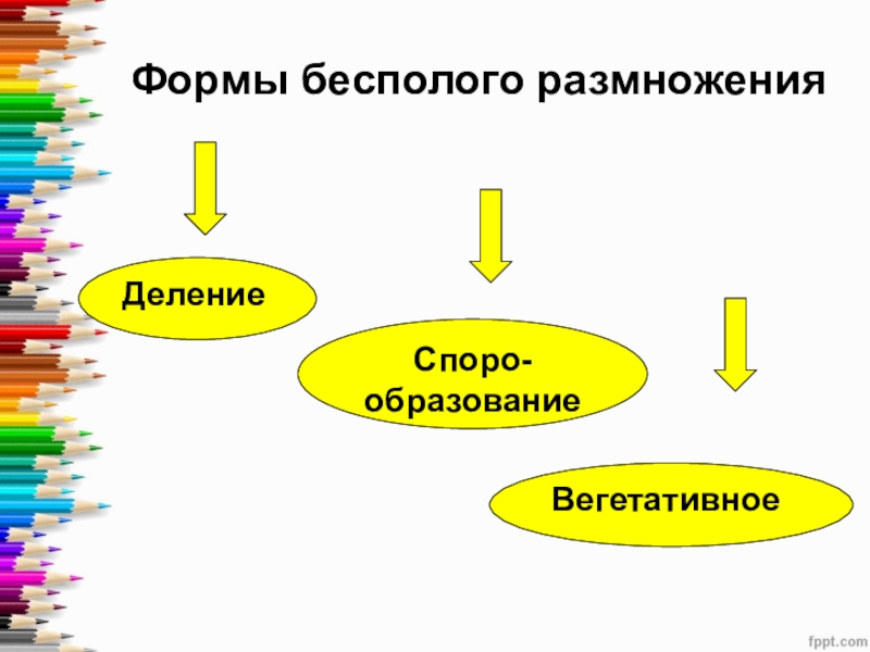 Формы бесполого размноженияДеление Споро-образование Вегетативное