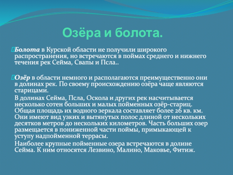 Наиболее крупные пойменные озера встречаются в долине Сейма. К ним относятся Лезвино, Малино, Маковье, Фитиж.