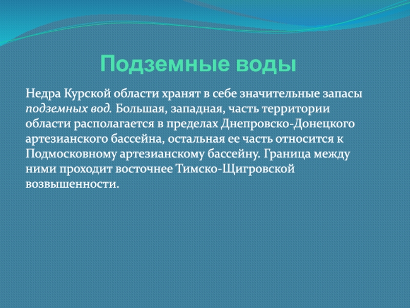 артезианского бассейна, остальная ее часть относится к Подмосковному артезианскому бассейну. Граница между ними проходит восточнее Тимско-Щигровской возвышенности.