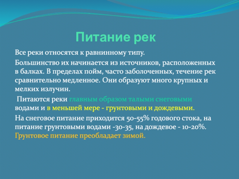 Питаются реки главным образом талыми снеговыми водами и в меньшей мере - грунтовыми и дождевыми.
