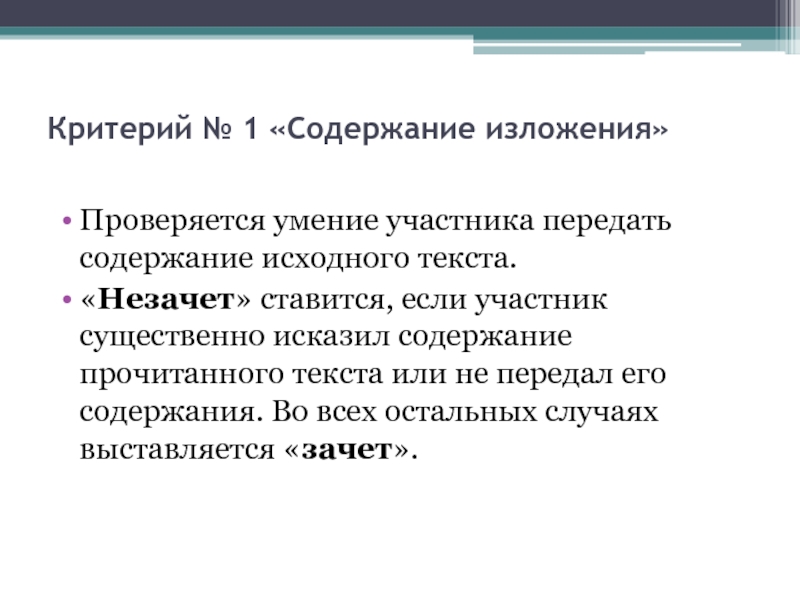 если в изложении совершенно отсутствуют элементы стиля исходного текста. Во всех остальных случаях выставляется «зачет».