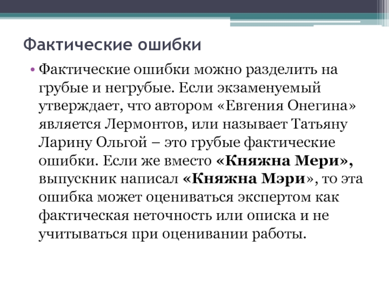 называет Татьяну Ларину Ольгой – это грубые фактические ошибки. Если же вместо «Княжна Мери», выпускник написал «Княжна Мэри», то эта ошибка может оцениваться экспертом как фактическая неточность или описка и не учитываться при оценивании работы.