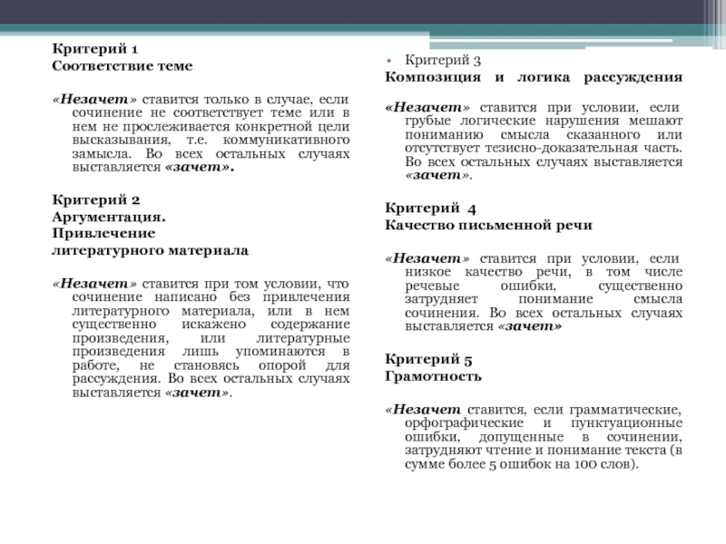 «Незачет» ставится при том условии, что сочинение написано без привлечения литературного материала, или в нем существенно искажено содержание произведения, или литературные произведения лишь упоминаются в работе, не становясь опорой для рассуждения. Во всех остальных случаях выставляется «зачет».
