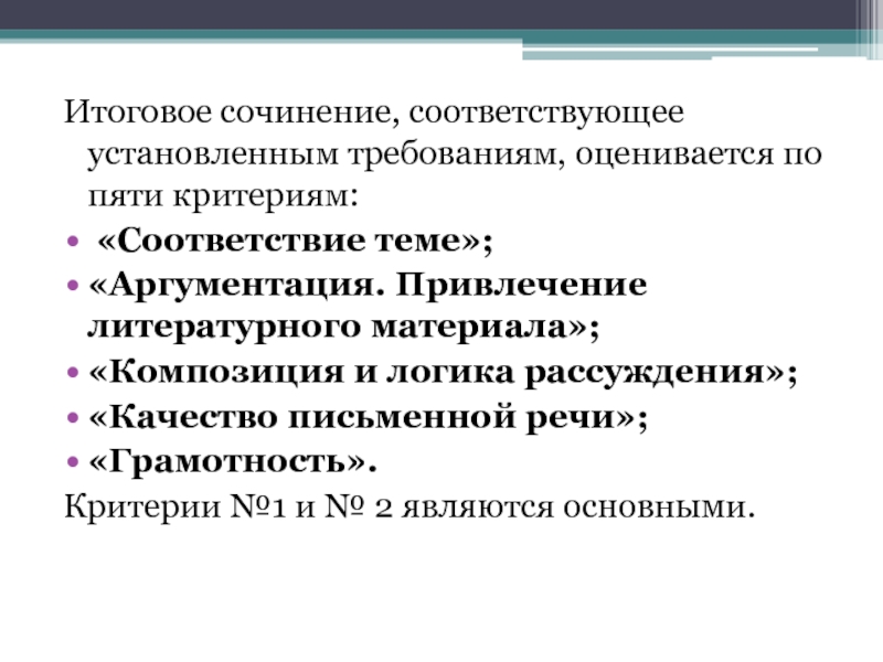 Итоговое сочинение, соответствующее установленным требованиям, оценивается по пяти критериям: