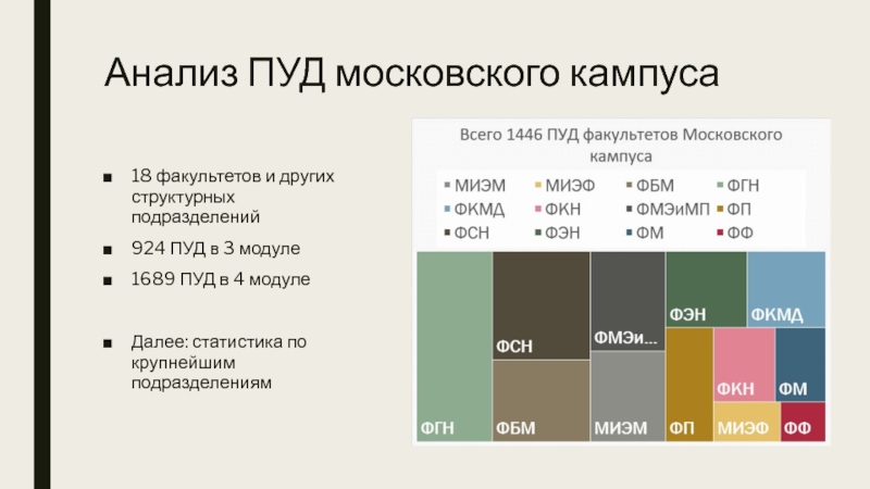 Анализ ПУД московского кампуса18 факультетов и других структурных подразделений924 ПУД в 3 модуле1689 ПУД в 4 модулеДалее: