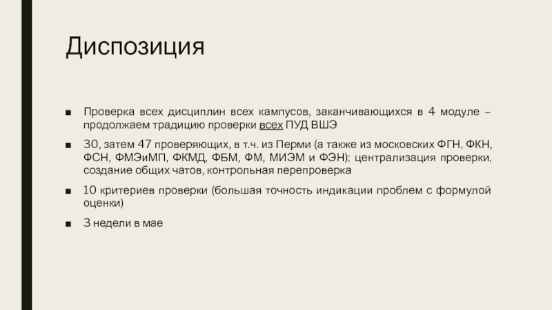 ДиспозицияПроверка всех дисциплин всех кампусов, заканчивающихся в 4 модуле – продолжаем традицию проверки всех ПУД ВШЭ30, затем 47 проверяющих, в т.ч. из Перми (а также из московских ФГН, ФКН, ФСН, ФМЭиМП,