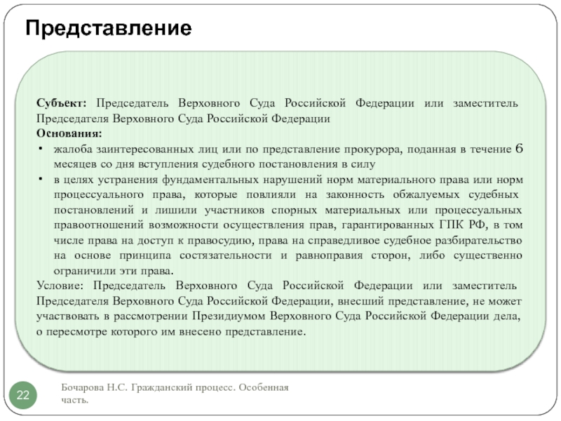 Условие: Председатель Верховного Суда Российской Федерации или заместитель Председателя Верховного Суда Российской Федерации, внесший представление, не может участвовать в рассмотрении Президиумом Верховного Суда Российской Федерации дела, о пересмотре которого им внесено представление.