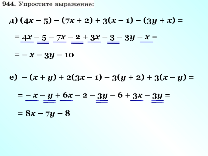 д) (4х – 5) – (7х + 2) + 3(х – 1) – (3у + х) =