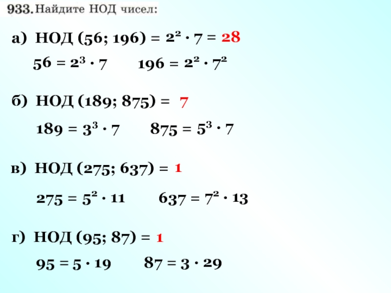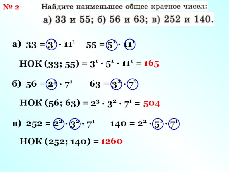 3. Каждое из выписанных простых чисел взять с наибольшим из показателей степени, с которым оно входит в разложения данных чисел.