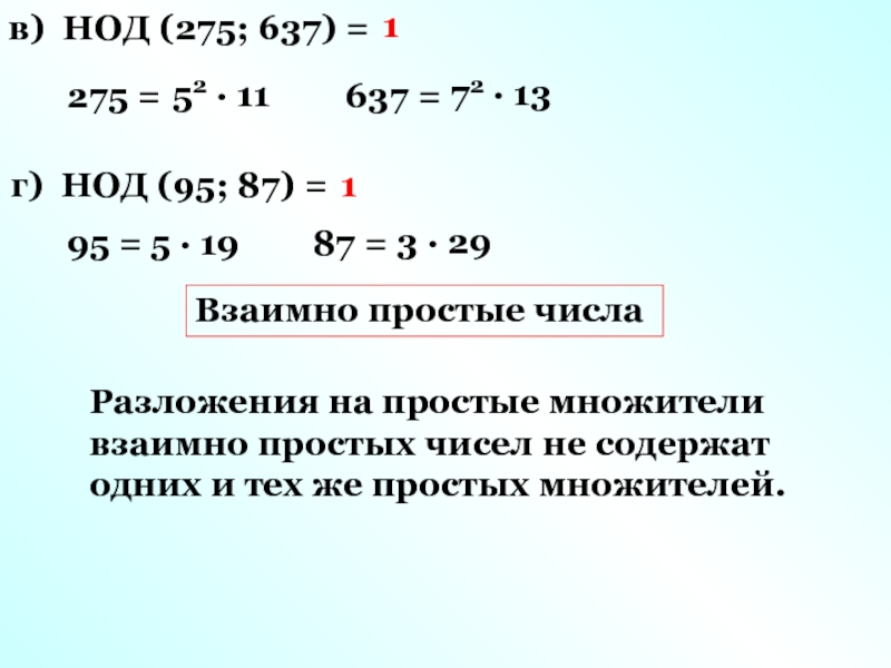 Разложения на простые множители взаимно простых чисел не содержат одних и тех же простых множителей.