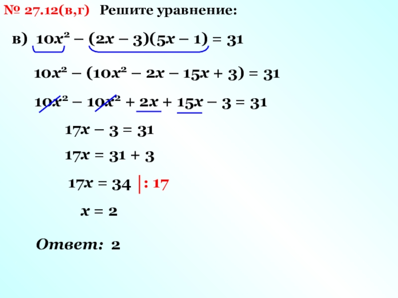 10х2 – 10х2 + 2х + 15х – 3 = 31