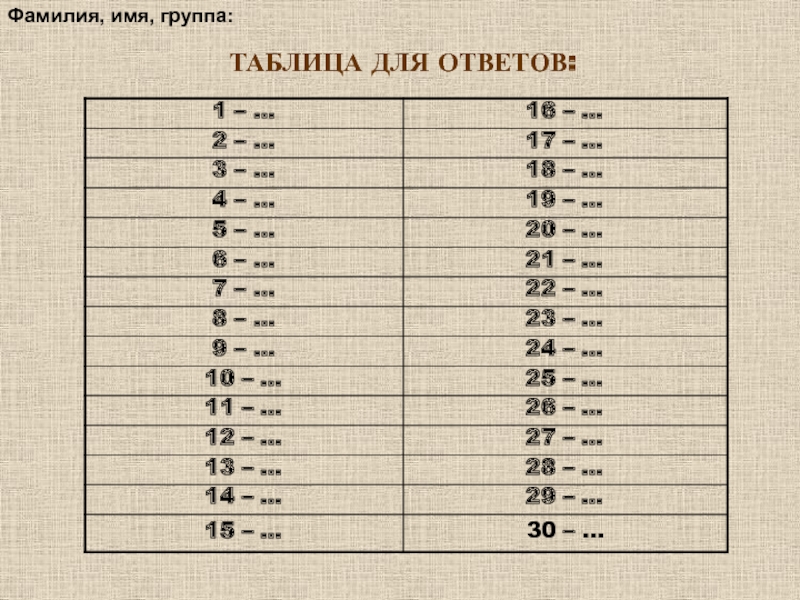 Слайд 32ТАБЛИЦА ДЛЯ ОТВЕТОВ: