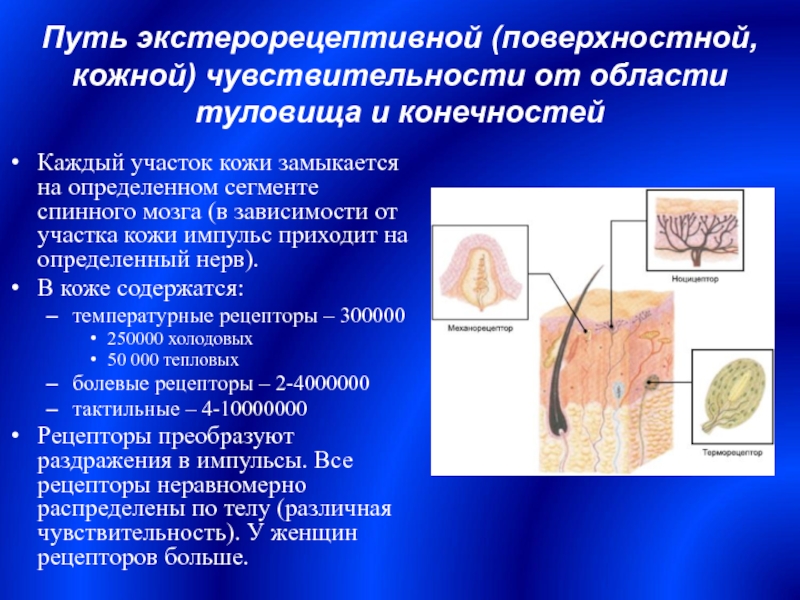 Рецепторы преобразуют раздражения в импульсы. Все рецепторы неравномерно распределены по телу (различная чувствительность). У женщин рецепторов больше.