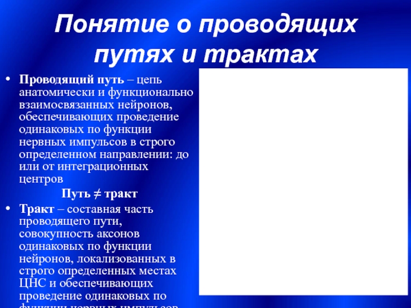 Тракт – составная часть проводящего пути, совокупность аксонов одинаковых по функции нейронов, локализованных в строго определенных местах ЦНС и обеспечивающих проведение одинаковых по функции нервных импульсов.