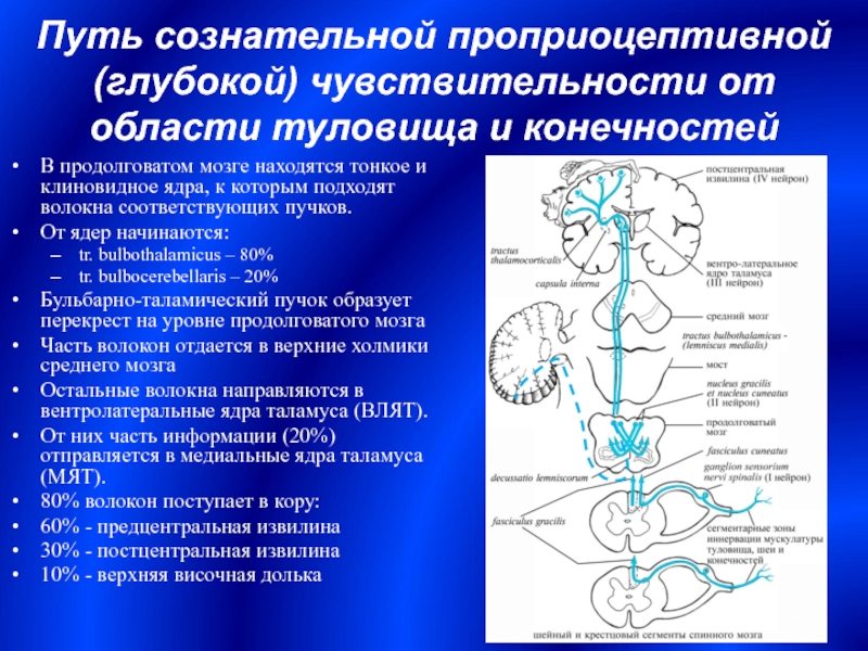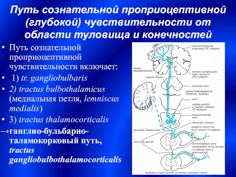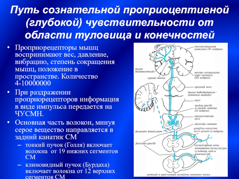 Слайд 12Путь сознательной проприоцептивной (глубокой) чувствительности от области туловища и конечностей