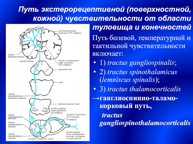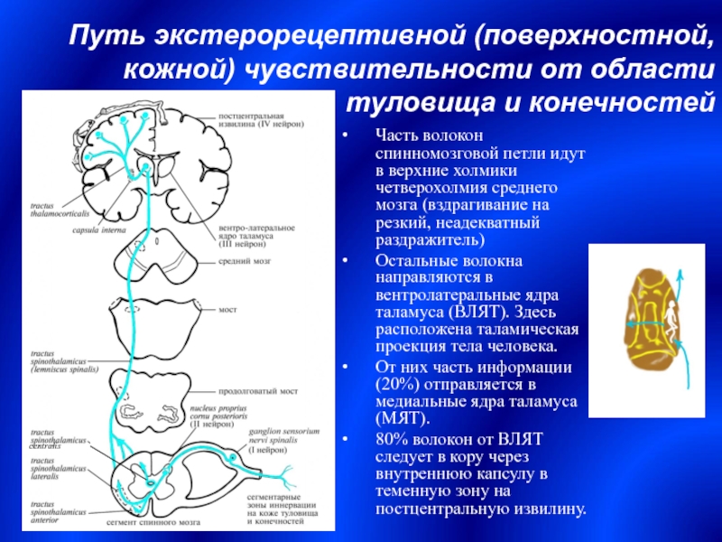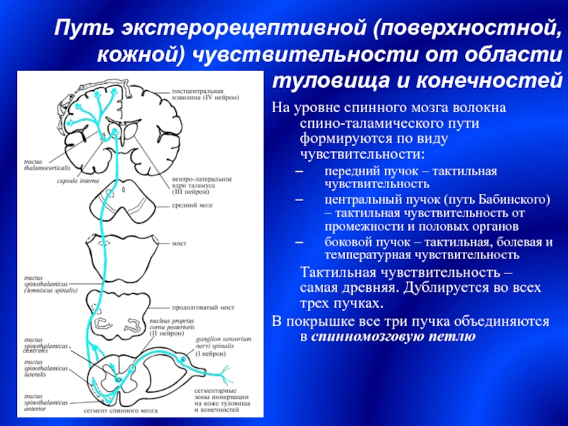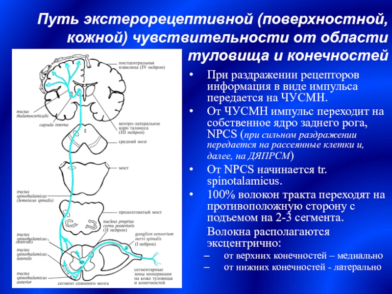 Слайд 7Путь экстерорецептивной (поверхностной, кожной) чувствительности от области туловища и конечностей