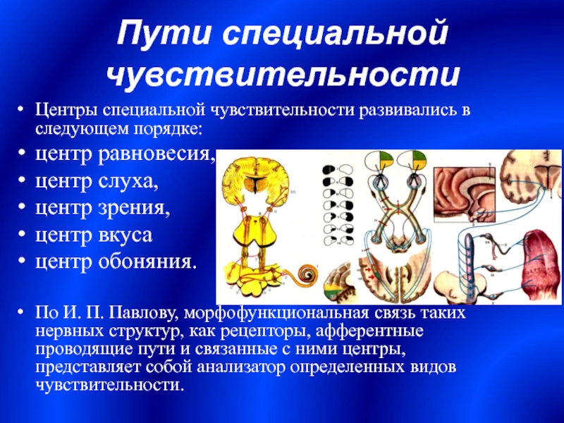 П. Павлову, морфофункциональная связь таких нервных структур, как рецепторы, афферентные проводящие пути и связанные с ними центры, представляет собой анализатор определенных видов чувствительности.