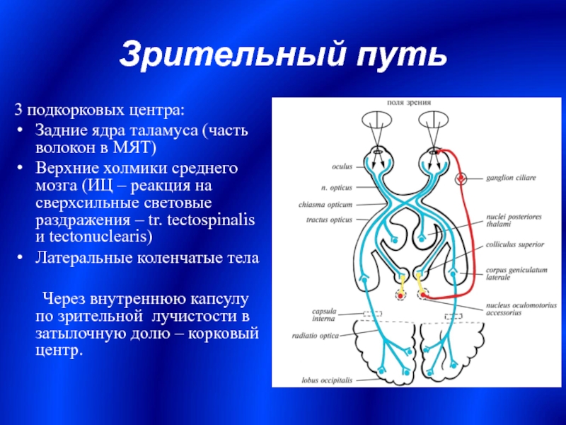 Через внутреннюю капсулу по зрительной лучистости в затылочную долю – корковый центр.