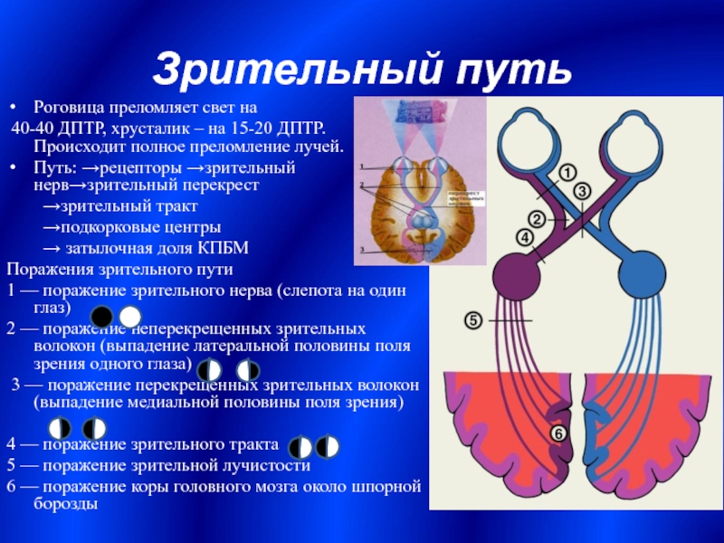 3 — поражение перекрещенных зрительных волокон (выпадение медиальной половины поля зрения)