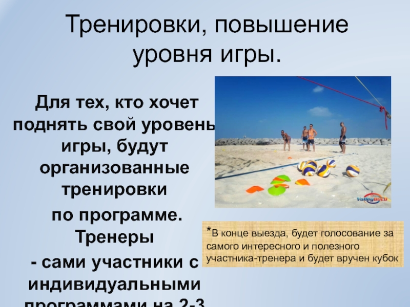 *В конце выезда, будет голосование за самого интересного и полезного участника-тренера и будет вручен кубок