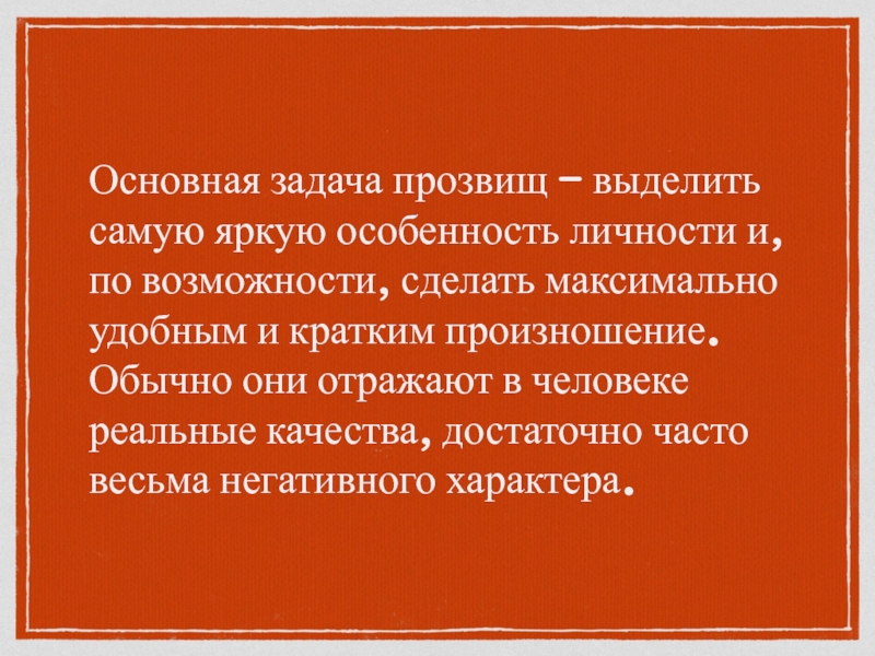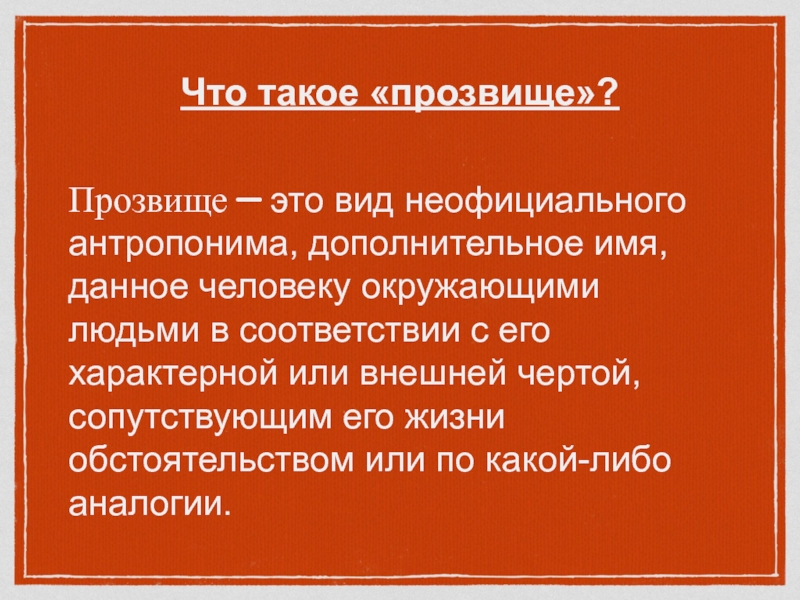 это вид неофициального антропонима, дополнительное имя, данное человеку окружающими людьми в соответствии с его характерной или внешней чертой, сопутствующим его жизни обстоятельством или по какой-либо аналогии.