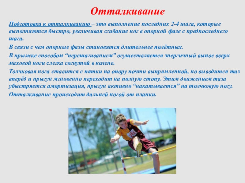 Подготовка к отталкиванию – это выполнение последних 2-4 шага, которые