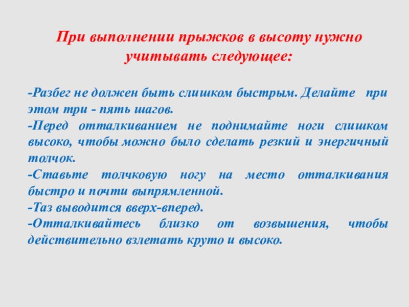 Слайд 15При выполнении прыжков в высоту нужно учитывать следующее:
