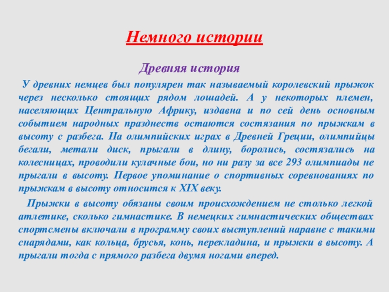 у некоторых племен, населяющих Центральную Африку, издавна и по сей день основным событием народных празднеств остаются состязания по прыжкам в высоту с разбега. На олимпийских играх в Древней Греции, олимпийцы бегали, метали диск, прыгали в длину, боролись, состязались на колесницах, проводили кулачные бои, но ни разу за все 293 олимпиады не прыгали в высоту. Первое упоминание о спортивных соревнованиях по прыжкам в высоту относится к XIX веку.